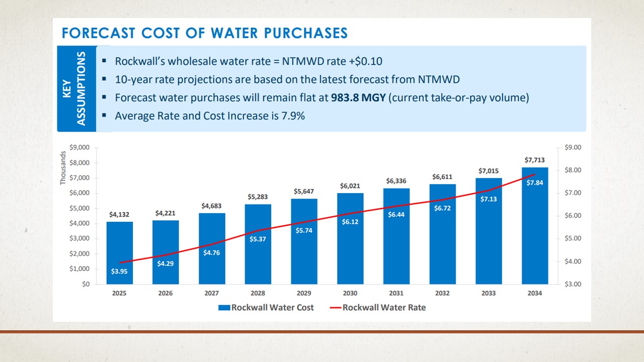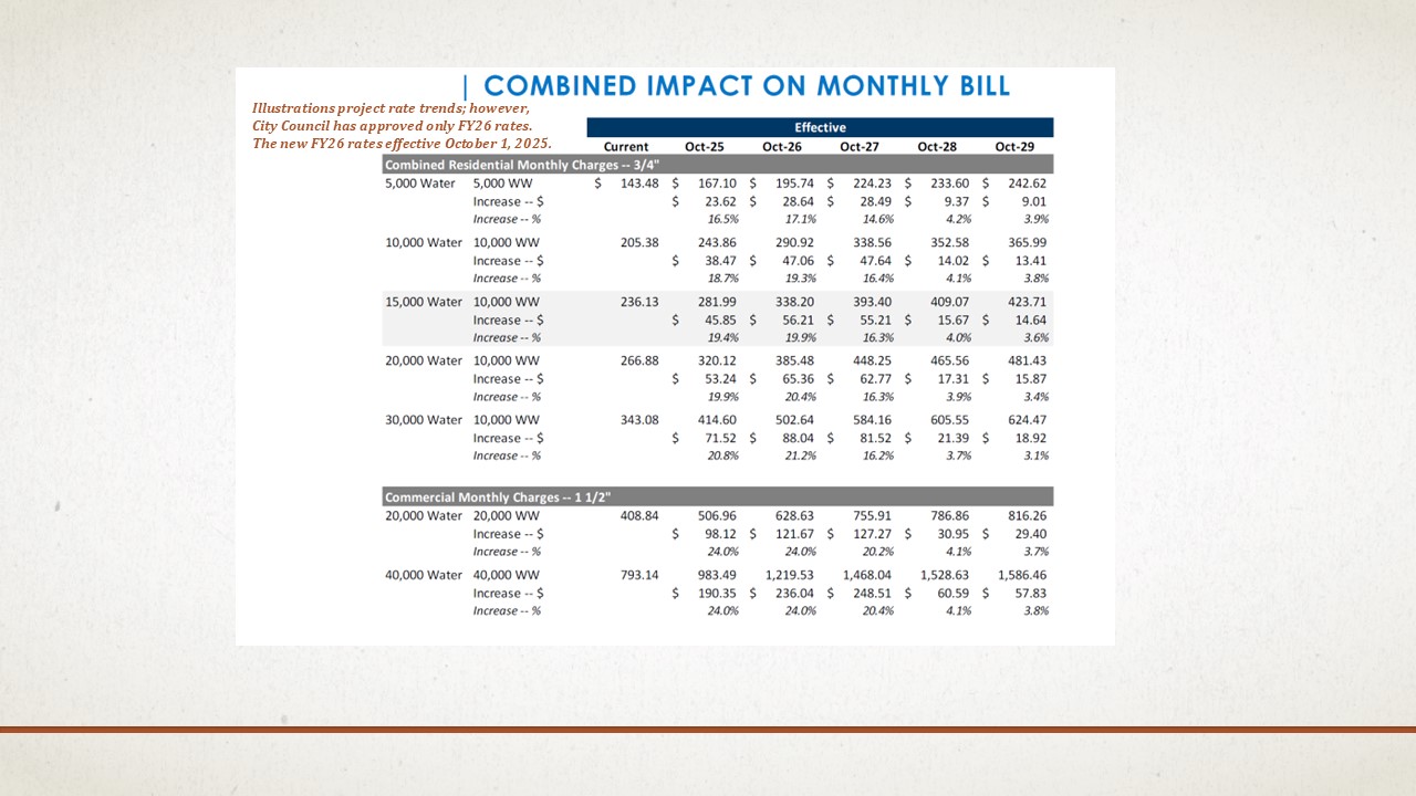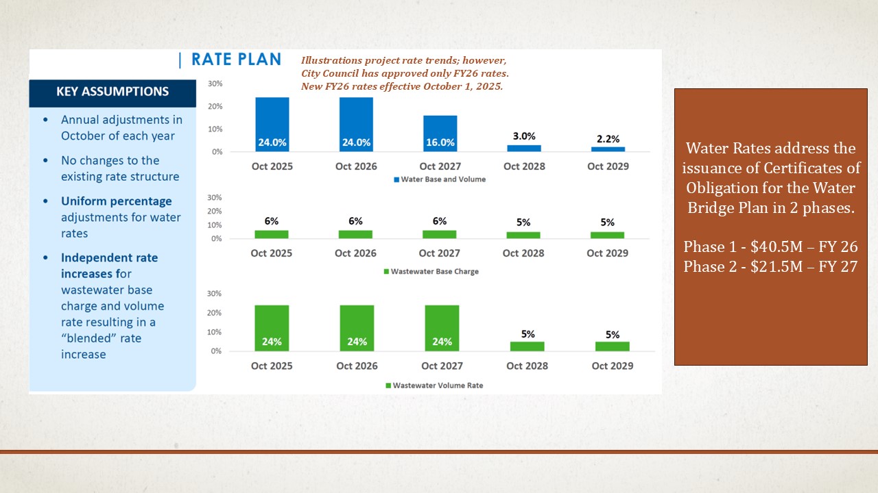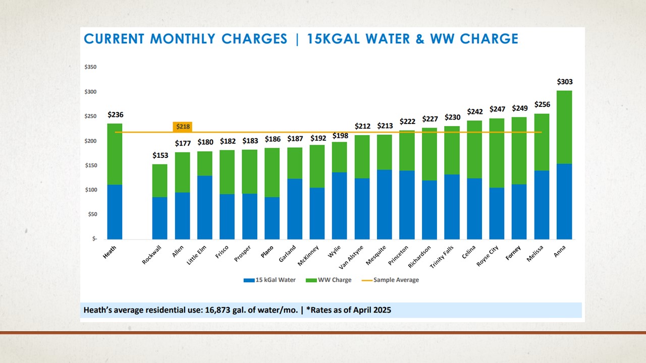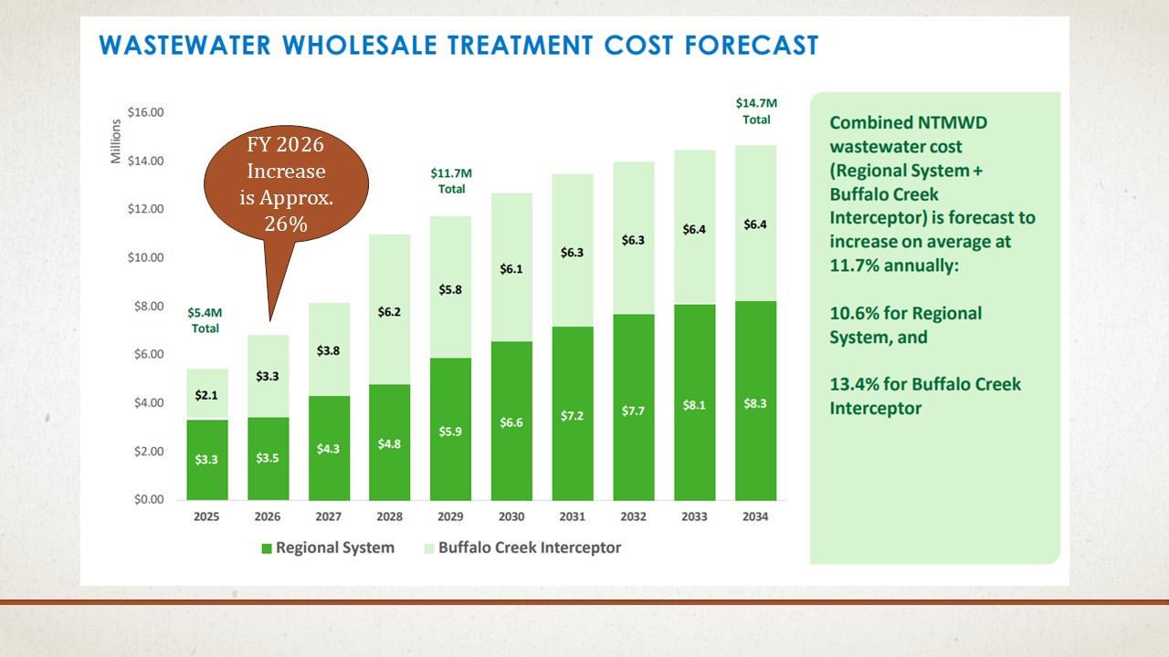 Water and Sewer rates will increase by approximately 25% to address increasing costs from the North Texas Municipal Water District and to fund a bond issue that will provide funding to implement the Water Bridge Plan, which includes two new water storage facilities and the construction of up to six potable water wells. The new rates are also effective beginning October 1, 2025.