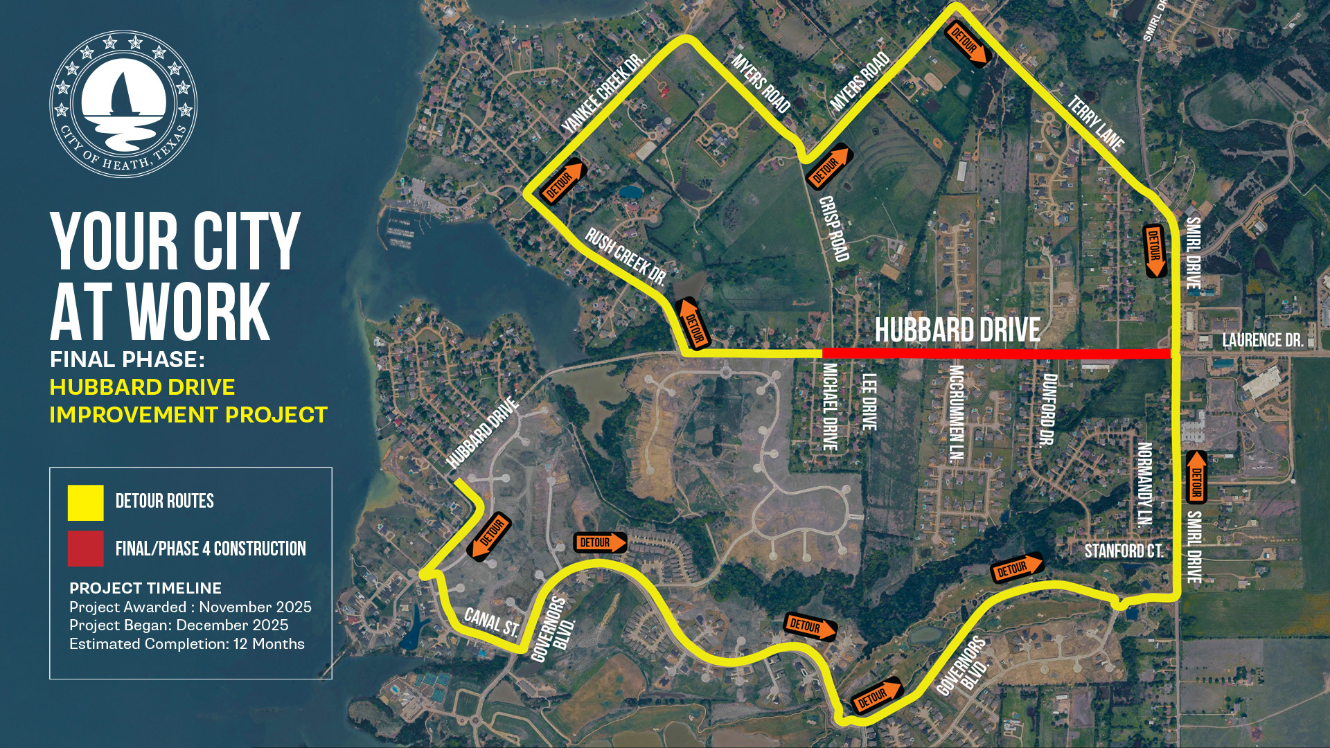 Construction on the final phase of Hubbard Drive should begin in December and is expected to be completed within 12 months. Extensive communication regarding detours will include direct mail to residents in the area and road signage in the coming weeks. Stay tuned and sign up for TextMyGov notifications by texting HEATH to 91896.