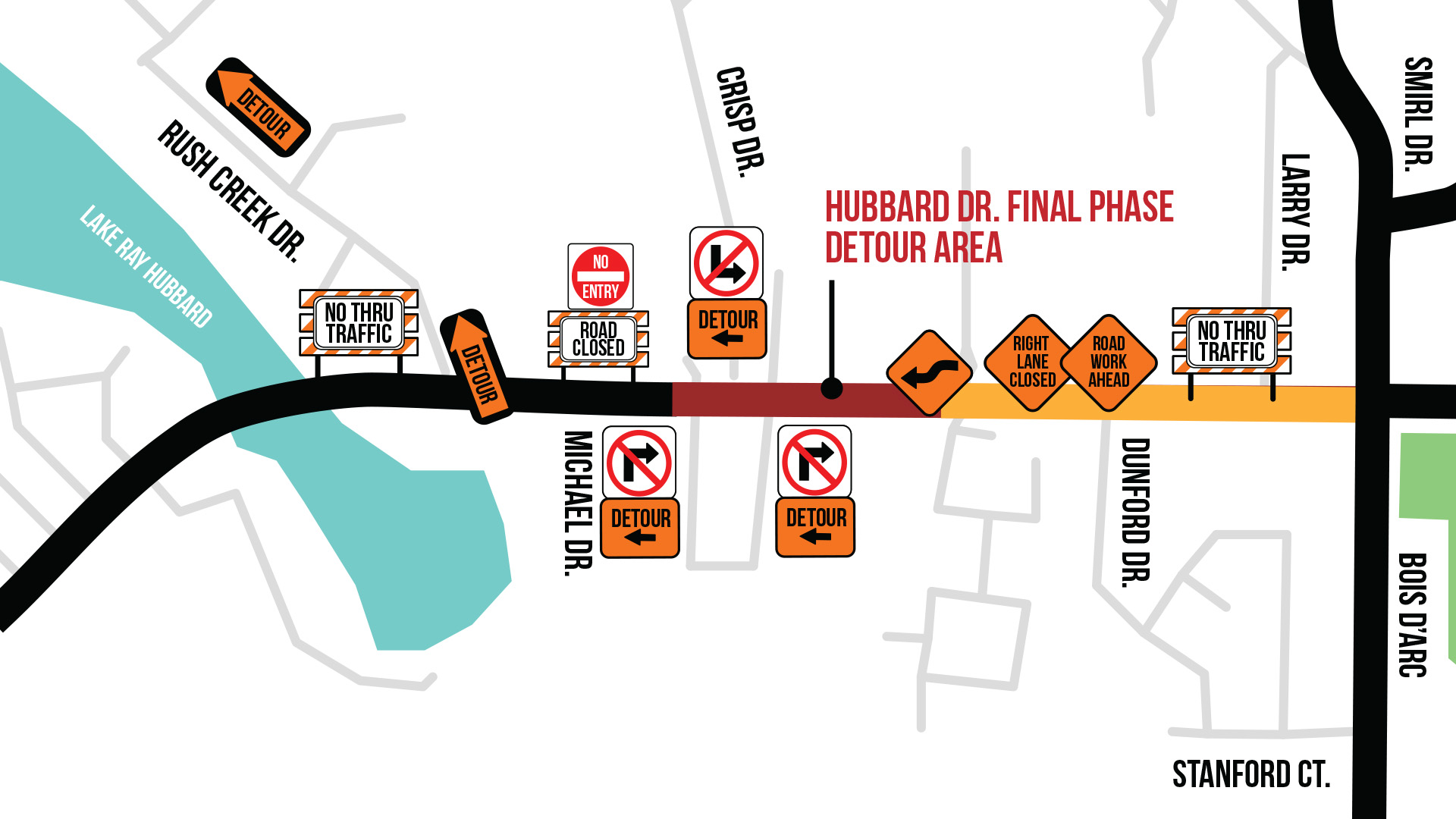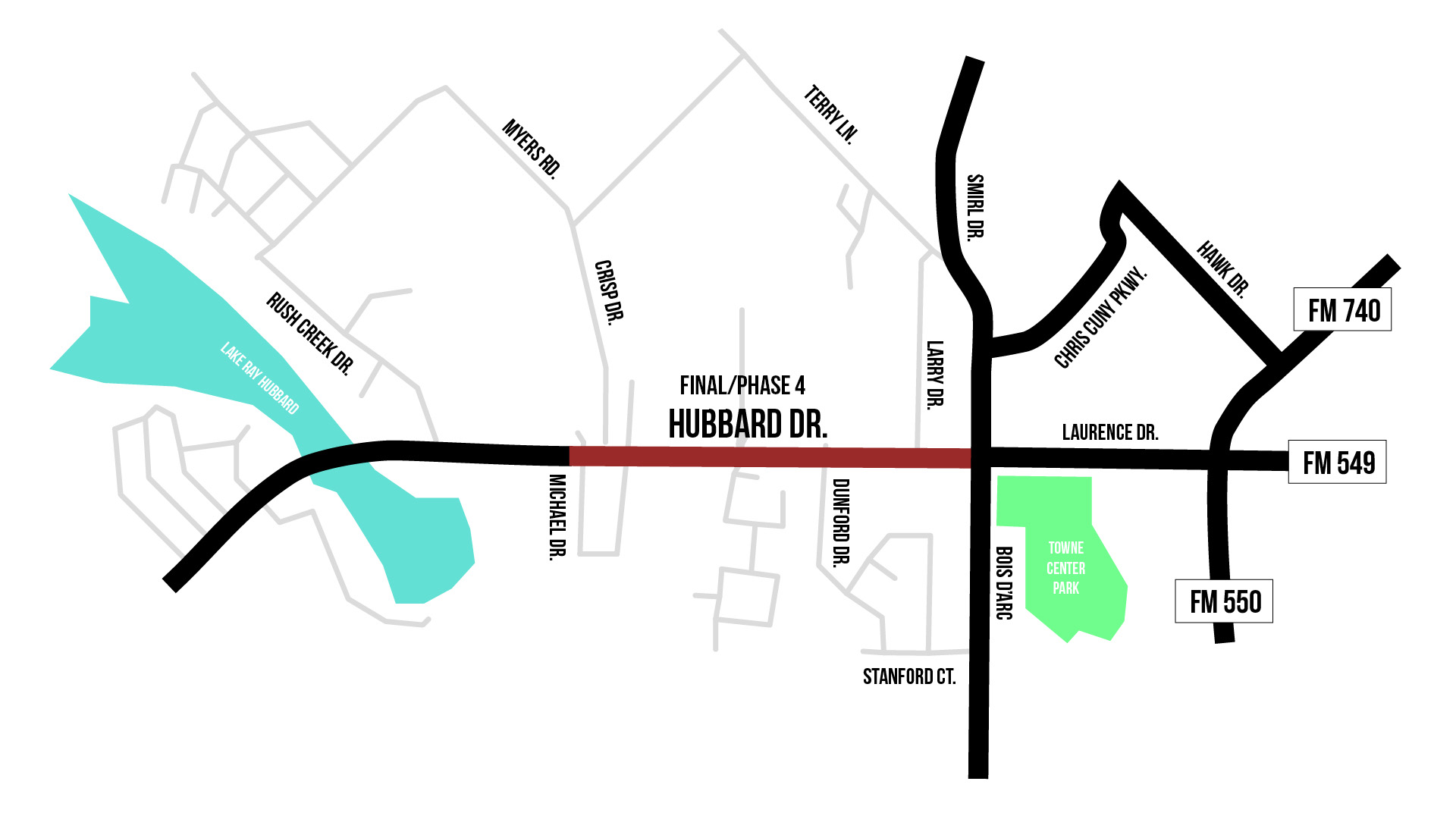 The fourth and final phase of the Hubbard Drive Improvement Project encompasses the reconstruction of the roadway from Michael Lane to Smirl/Bois d’Arc Road.